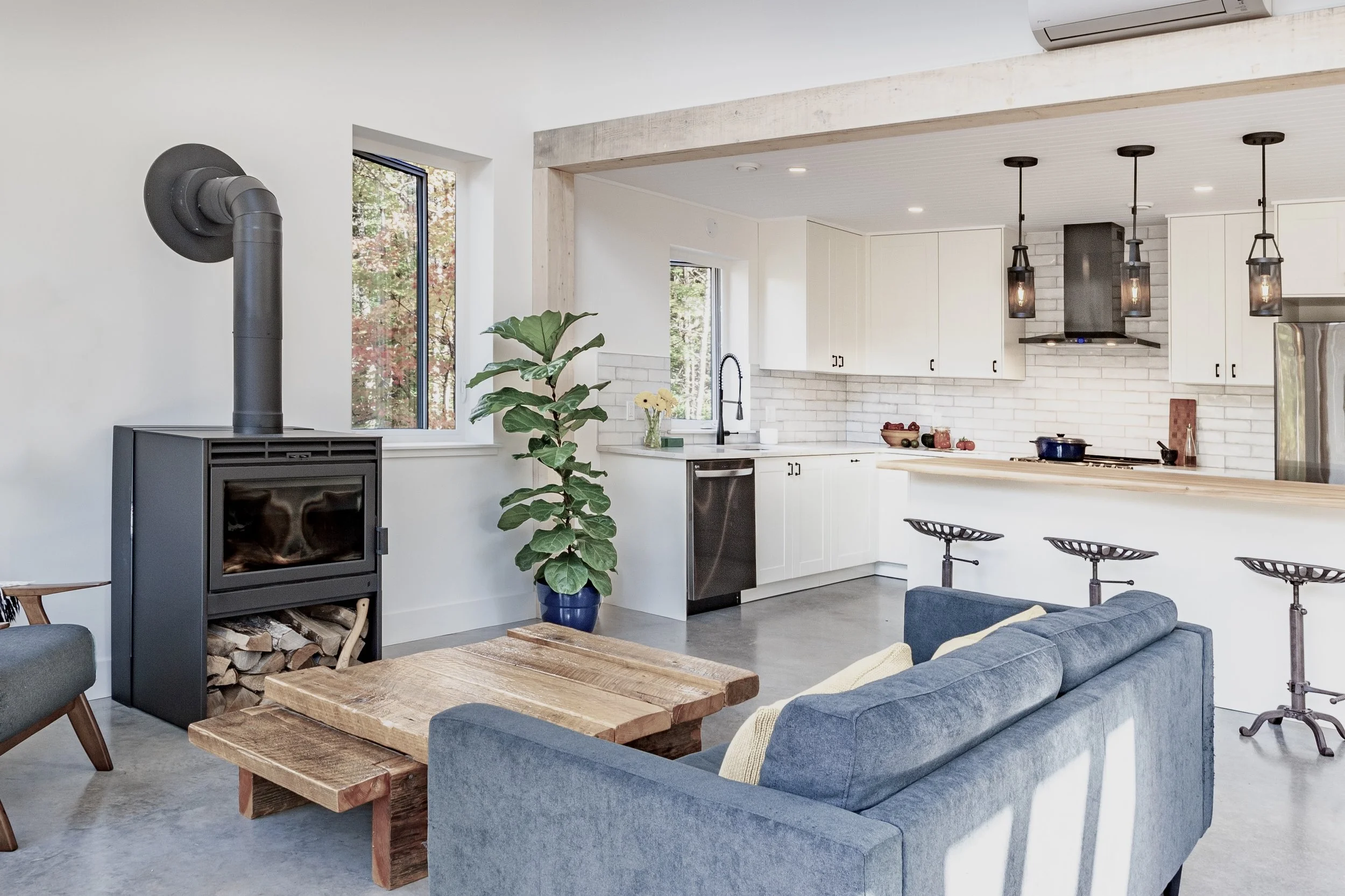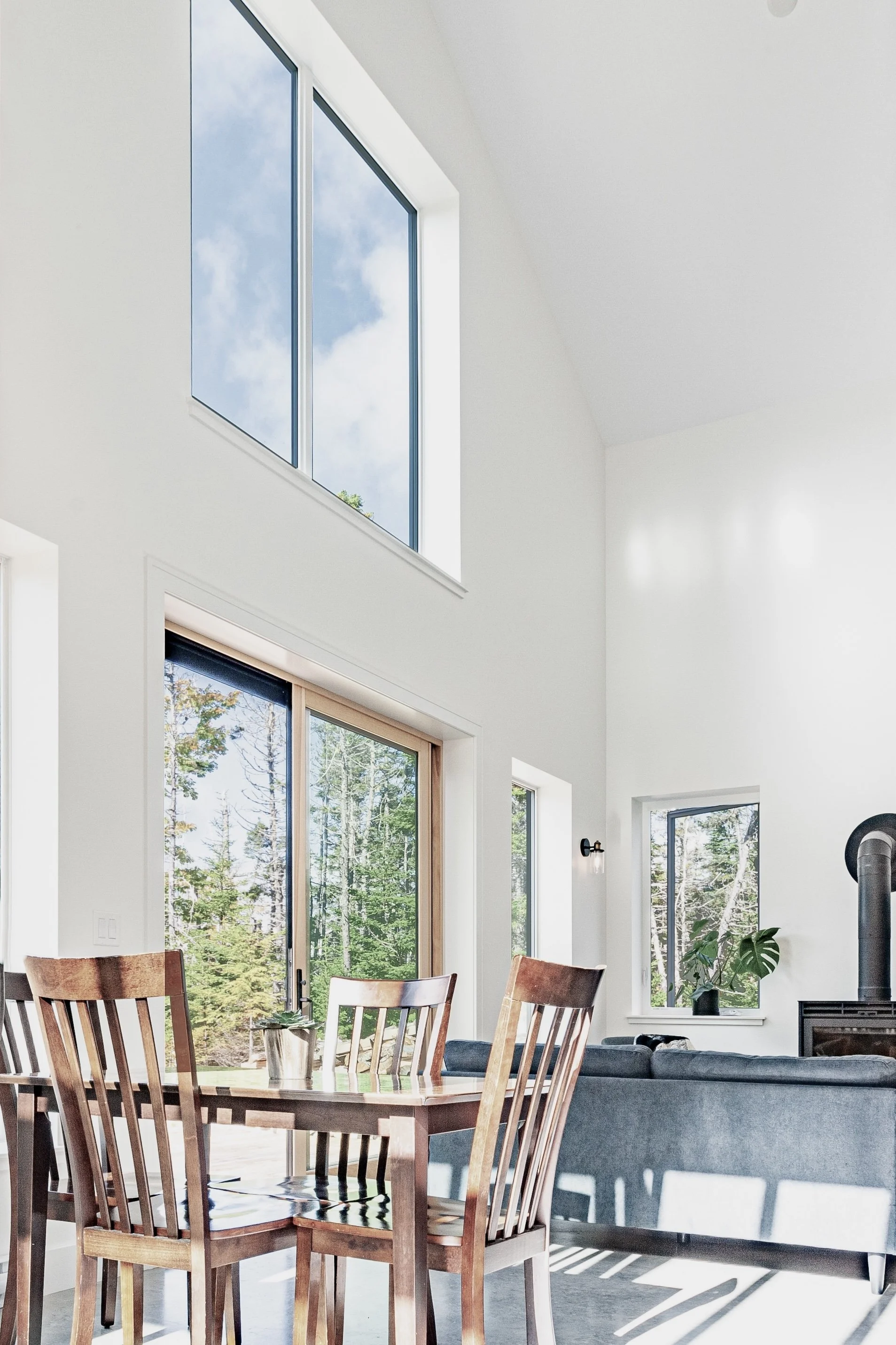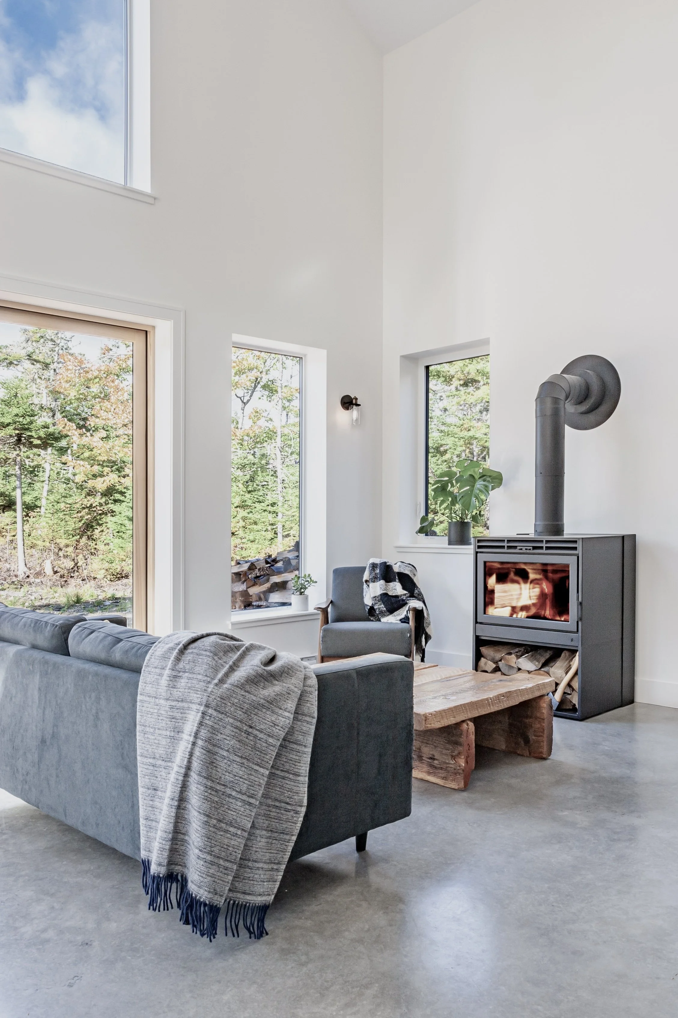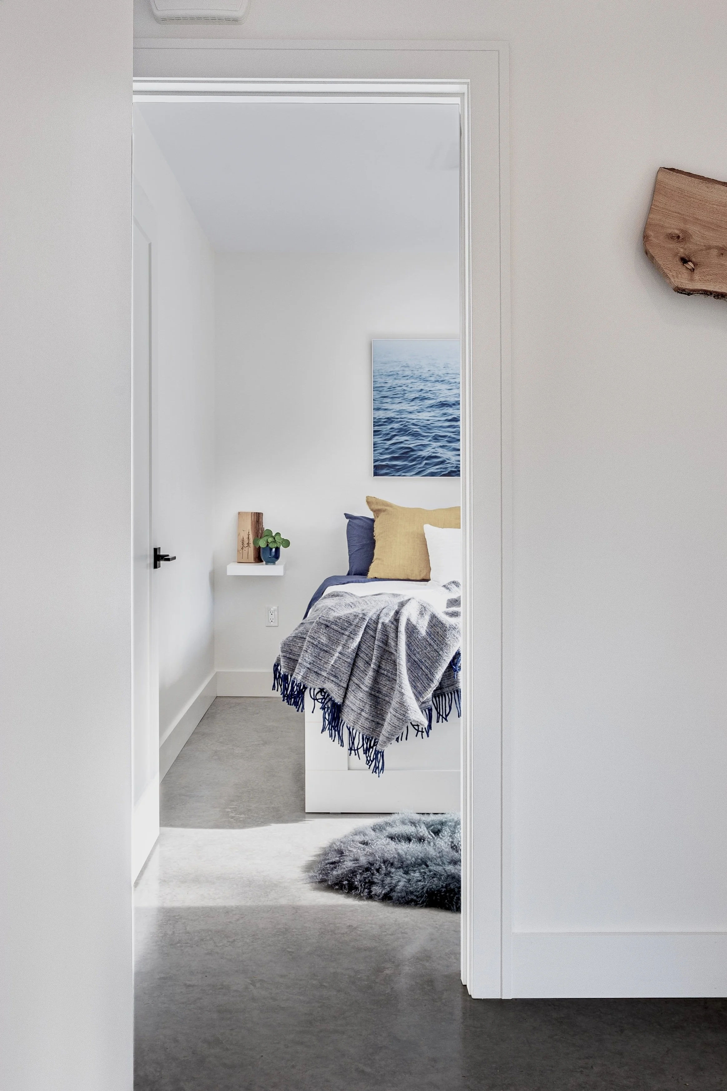 The Scandinavian-style aesthetic, with white walls, concrete floors and wood accents, creates a beautiful backdrop for the patterns of light and shadow that filter through trees into the home on sunny days. The views of the forest are the true focal point of the space. The premise behind the aesthetic is rugged and natural (rather than cute). The spaces were designed to be uplifting, calm and relaxing.