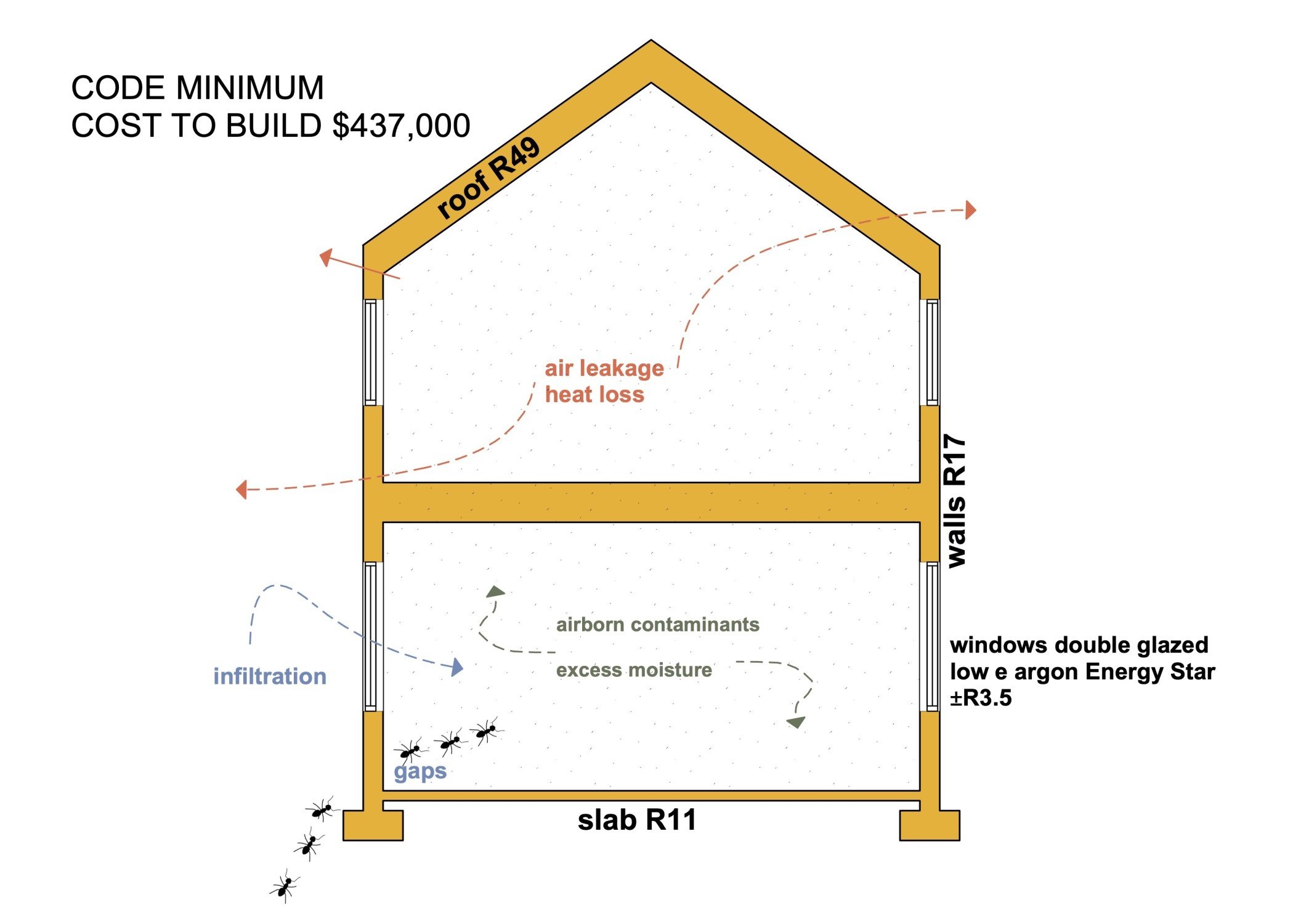 High performance targets were planned for the project from the first meeting with the owners, however the economic model starts with building code minimum as a base case for comparison. Compliance with the National Building Code ensures a structurally safe building that meets minimally acceptable levels of energy efficiency. Houses built in Nova Scotia today are warmer and healthier than ever, but a code minimum house is still the worst house we can build. A code house can still fall short in terms of comfort and they can cost a lot to heat and maintain.