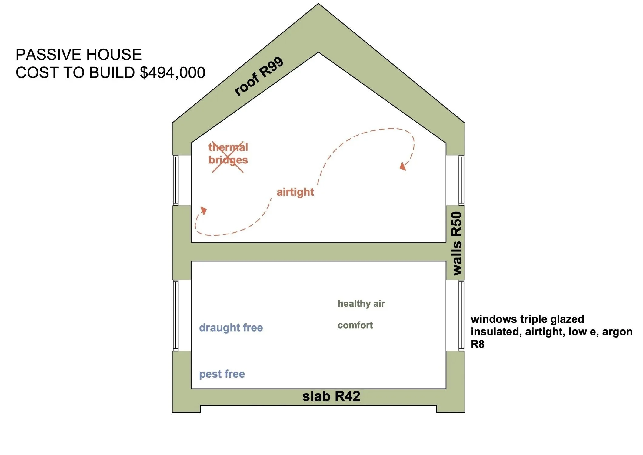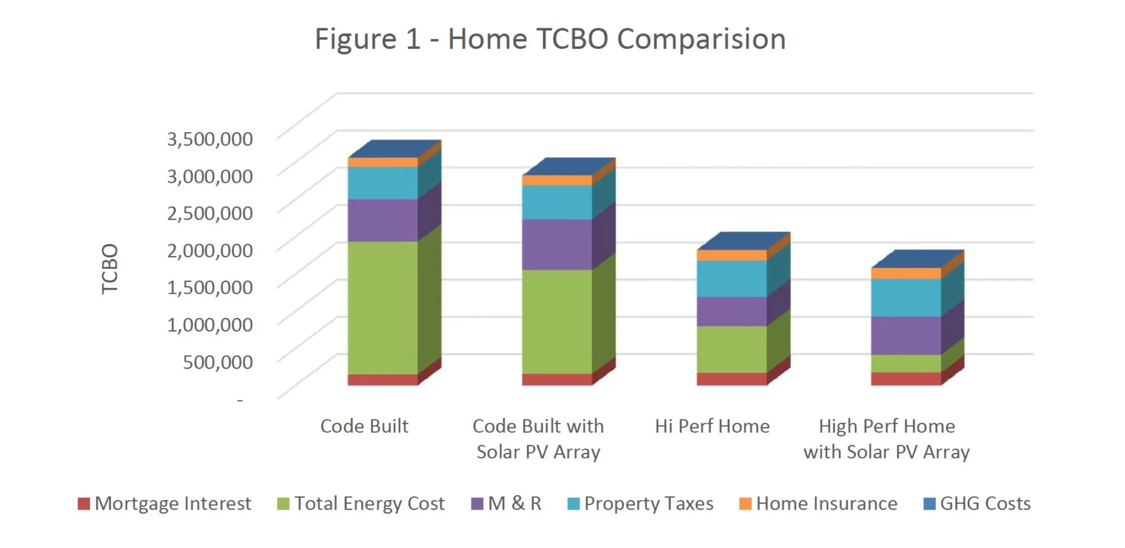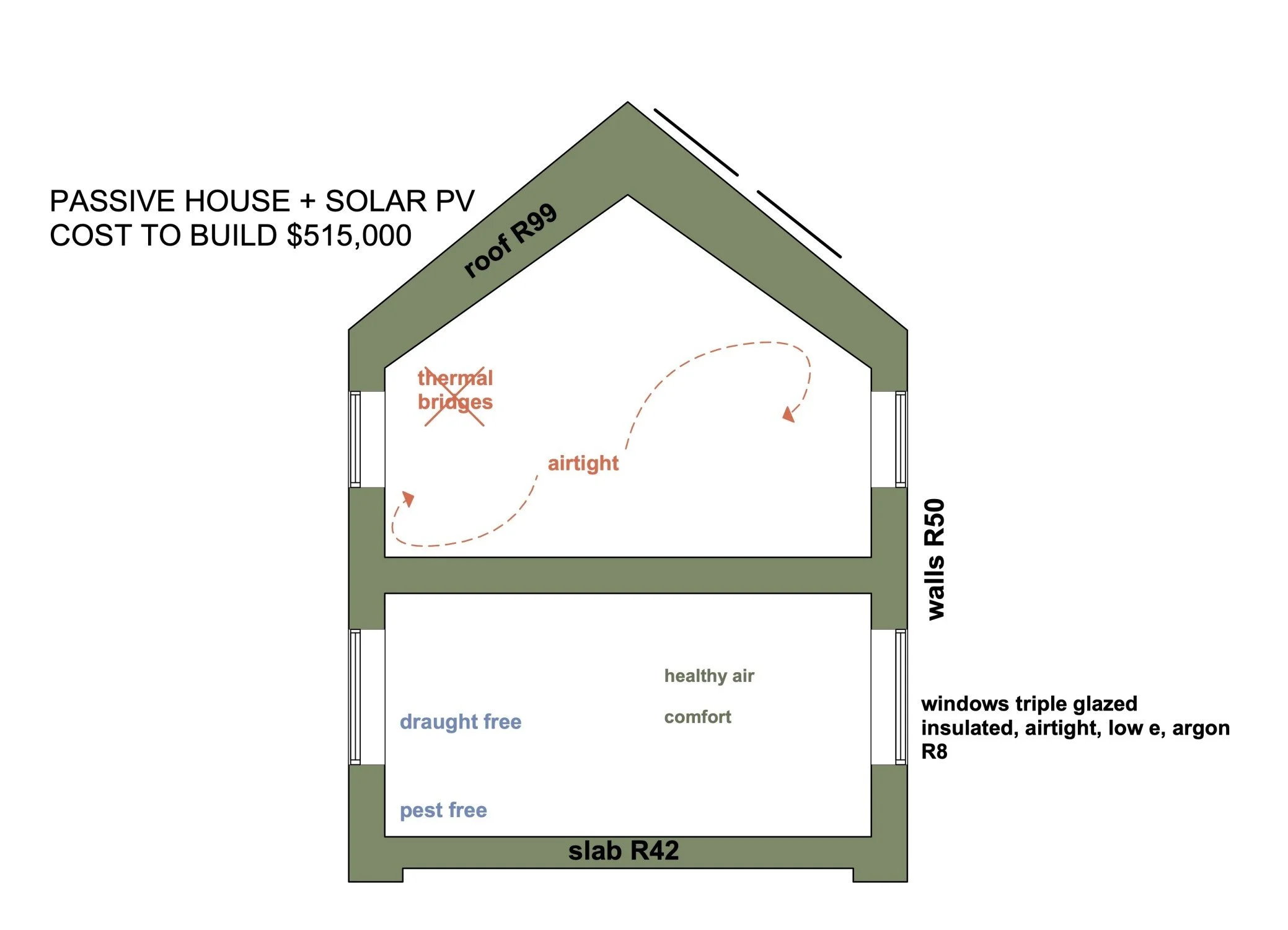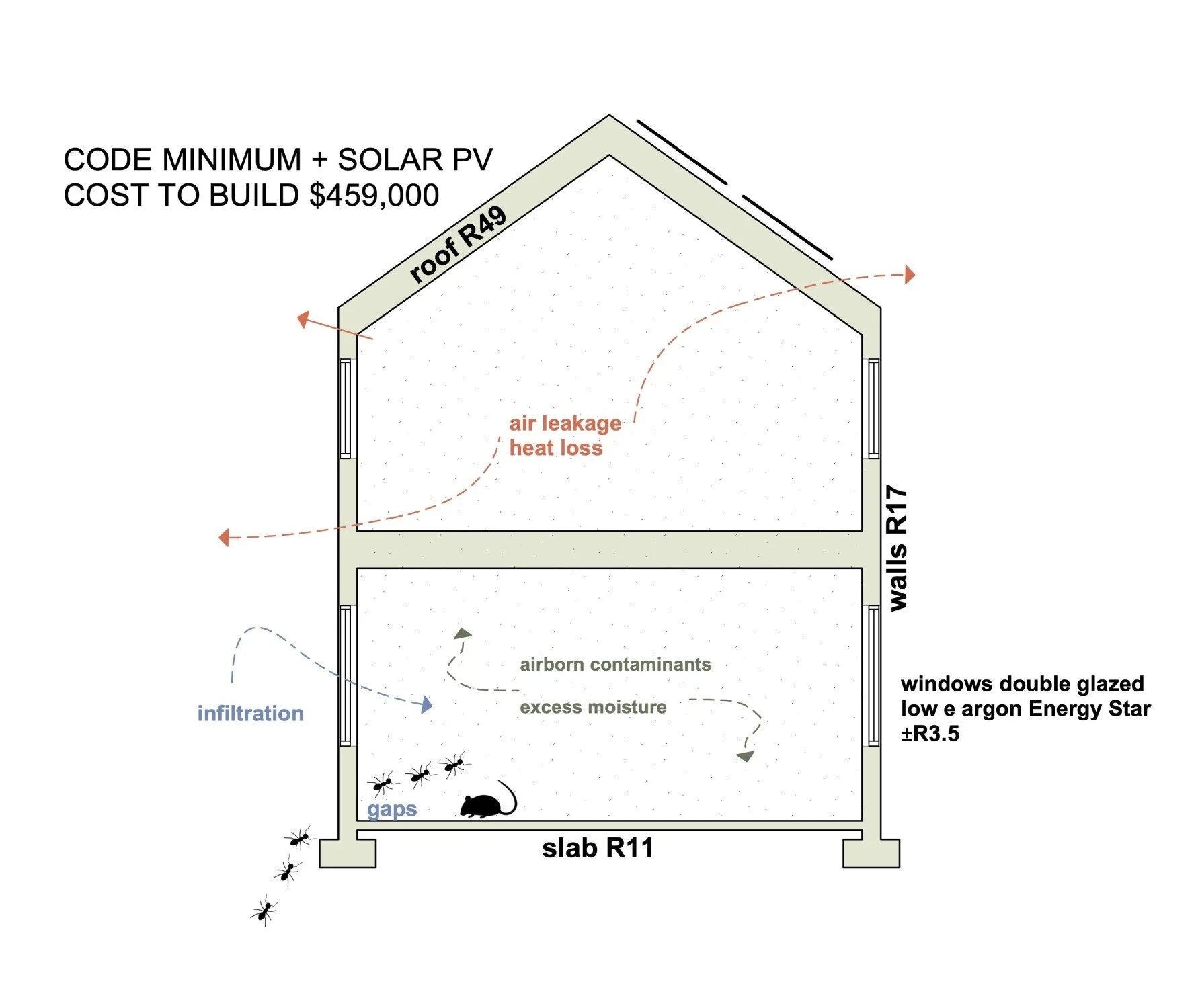 A common scenario is to build a code compliant home with solar panels, which are affordable and incentivized in Nova Scotia. This is a cheaper alternative to Passive House, and reduces operating costs in the short term, however adding a solar array increases the reliance on mechanicals. Over time the costs associated with maintaining and replacing mechanical components surpasses energy savings generated by solar panels.