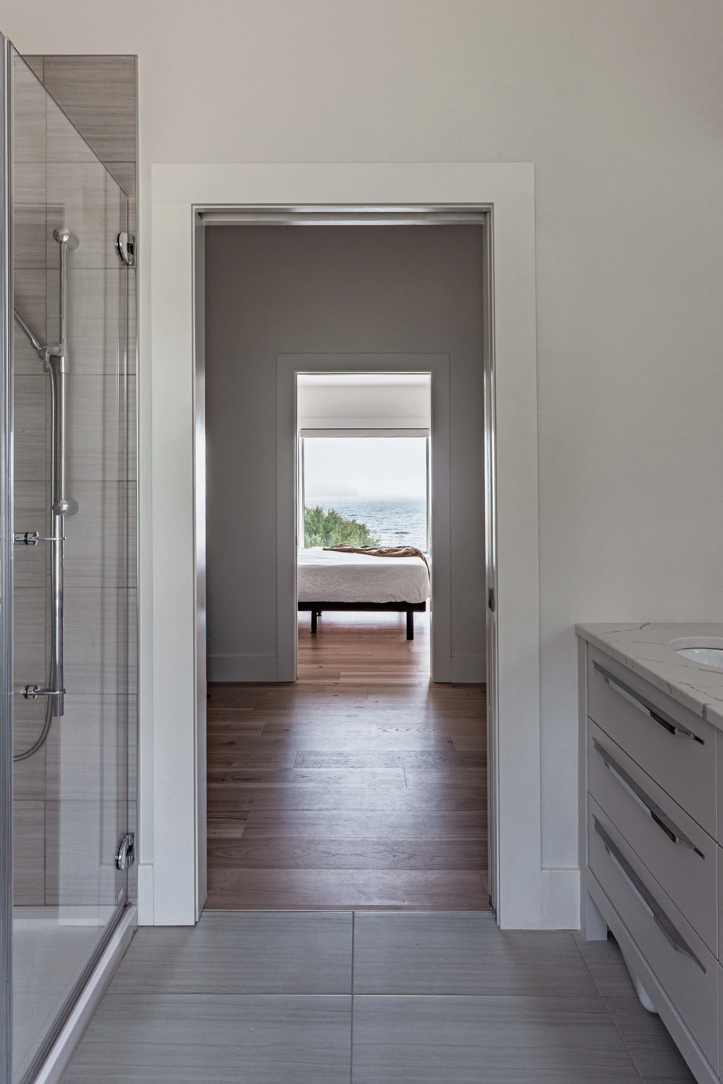 We subtly altered the home’s position on the site to celebrate the homeowners’ favored view, and added a generous deck that overlooks the ocean. We also ensured that guest bedrooms faced the water so visitors could take in the beautiful scenery.
